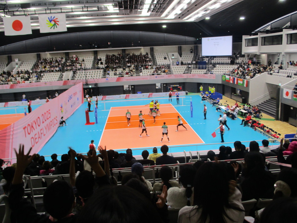 子どもたちは、事前に学校で、「デフリンピックとは何か」、「どんな工夫があるか」、「サインエール」などを学習しました。当日は、ウクライナ対メキシコの男子バレーボールの試合を観戦しました。