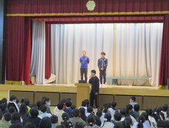 なわとび旬間 20XX年X月X日 なわとび名人のふっくんが来ました! 毎年本校ではこの時期に、なわとび旬間でとして体育や休み時間に縄跳びをしています。1月22日(木)には、毎年来てくれる縄跳び名人のゲスト・テーチャーが来てくれました。体育館で模範演技を行った後、校庭で縄跳びを教えてもらいました。