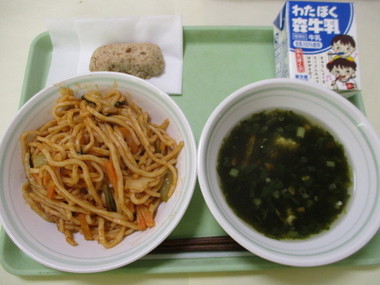 今日の献立 ・ソース焼きそば ・じゃがいものみそ和え ・大根と豆腐の中華スープ ・牛乳 |