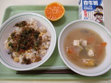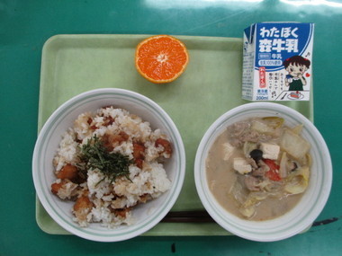 今日の献立 ・かしわごはん ・白菜の味噌鍋 ・菊花みかん ・牛乳 |