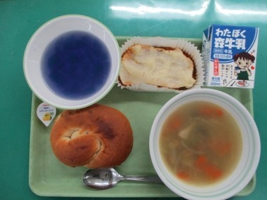 今日の献立 ・トマトたっぷりのスパゲッティ ・オニオンスープ ・あじさいゼリー ・牛乳 |