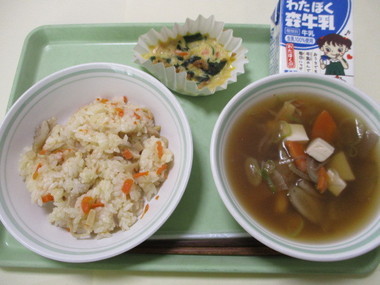 今日の献立 ・秋の香りごはん ・煮豆 ・いわしのつみれ汁 ・ぶどう ・牛乳 |