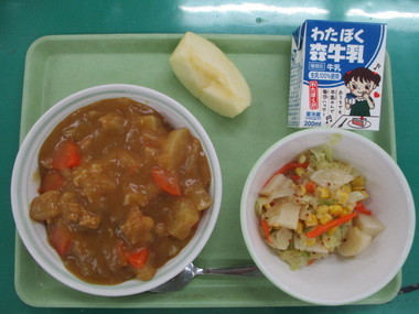 今日の献立 ・大根カレー ・ポテト入りフレンチサラダ ・りんご ・牛乳 |