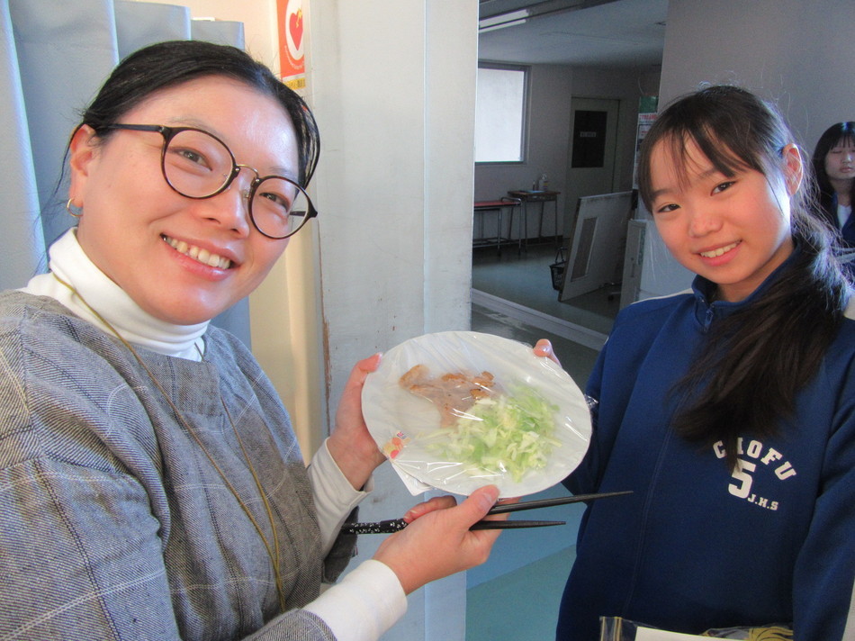授業の様子 @2年 家庭科 2024年12月17日 2年生は昨日に引き続き、「調理実習(メニュー:豚の生姜焼き)」行いました。 頑張って調理した「生姜焼き」は、学年の先生にもおすそ分けをしてくれました。職員室にメッセージ付きで届けられる「生姜焼き」とみなさんの姿にニコニコの先生たち。寒さも厳しくなってきましたが、何だか心がポカポカするひと時でした。おいしくいただきました&ごちそうさまでした!