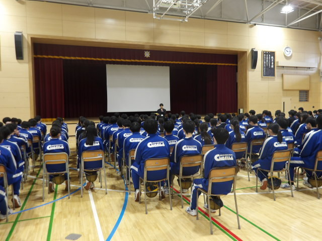 22日(月)全校朝礼で、校長講和と生活指導主任の話がありました。
