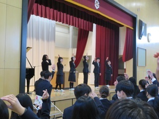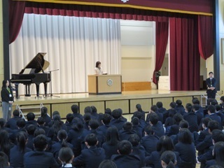 3学期始業式 2026年1月8日(木) 3学期始業式が行われました。 式の前には、新しく代替わりした2年生の発声隊による発声練習が行われました。 式の中では気持ちを新たにした校歌合唱に始まり、校長先生からは、 「欲望に支配されることなく健全な理性で他者を思いやり、自己をコントロールして鍛錬することが大切です。なりたい自分に向けて今年もMake Your Colorでよい自分にしていきましょう!」 とお話され、生徒も真剣なまなざしで聞き入っていました。