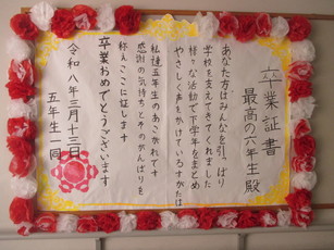 六年生教室前の廊下に、5年生からのすてきな贈り物が飾られていました。