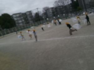 校庭で、袋を持って走ったり、風で膨らんだ袋を空へなげたりと、どんなことができるのか考えながらみんなで楽しみました。