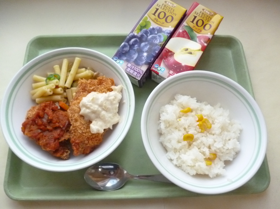 【献立】コーンライス・鮫のフライ・マカロニソテー・ジュース