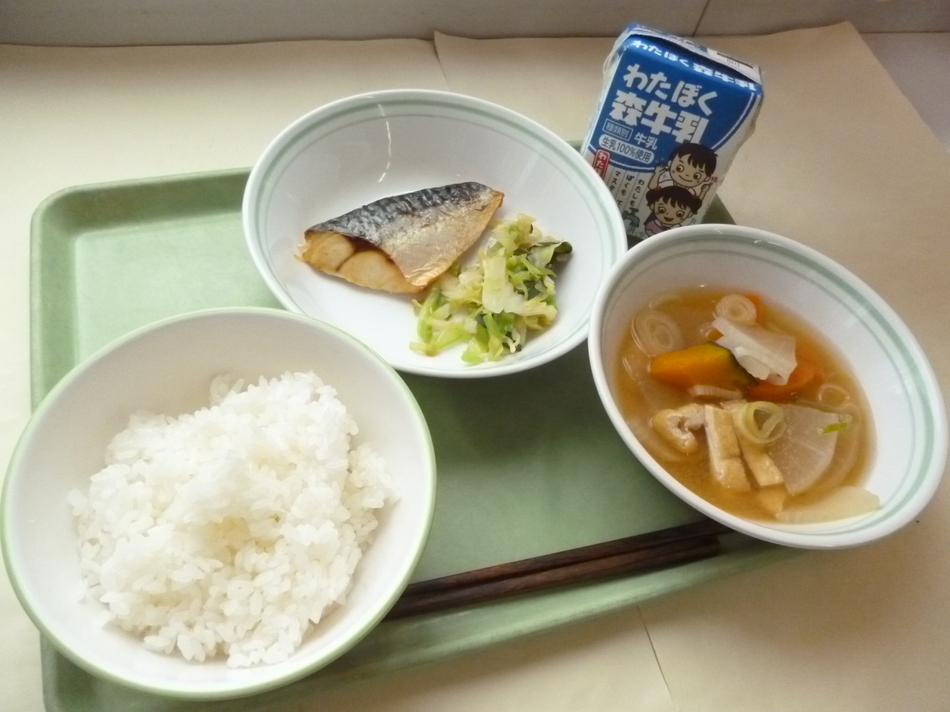 【献立】ごはん・鯖の文化干し・わかめの柚子和え・里芋のみそ汁・牛乳