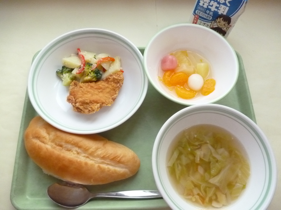 【献立】ソフトフランスパン・鶏肉のから揚げ・カラフルポテトサラダ・野菜スープ・白玉フルーツポンチ・牛乳