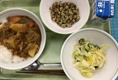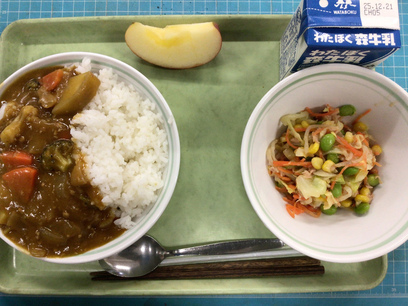 カレーライス フルーツ入りサラダ 青のりビーンズ