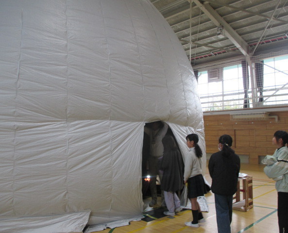 大きなドームに入った子どもたちは、息をのむような満天の星空に歓声をあげていました。 講師の先生は、星座の見つけ方や星の色の違いなど、学年に合わせた分かりやすい解説で、子どもたちの好奇心を刺激してくださいました。