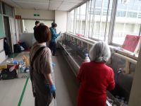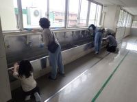 来週から、新学期が始まります。新1年生の子供たちが気持ちよく学校生活を送れるようにと、学校運営協議会・地域学校協働本部の方が地域に声をかけ、2階廊下の流しと1年生教室前にあるトイレの洗面所を掃除してくださいました。長く使っているので、こびりついた汚れは、スポンジでこすった程度では落ちませんでした。そこで、今回はプロの方に御協力いただき、汚れの落とし方を教えていただきながら約2時間作業しました。掃除前と比べると、流しも洗面所も見違えるほどきれいになりました。