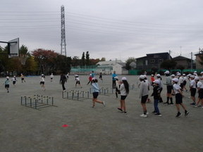 最後に、講師の方はハードルあり、数名の児童はハードルなしのコースで並走する競争をしました。