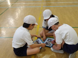 自分の課題解決に向けて必要な場を選んで活動できるように、様々な場を設定しました。また、ペアやトリオで活動を行い、互いの技を見合ってアドバイスをしました。跳び箱運動はあっという間に、技が終わってしまい、自分の体の動きがどうなっているか把握が難しいので、動画に撮って確認しました。タブレットは自分の体の動きをとらえるのに非常に役立っています。
