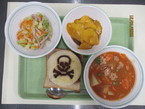10/31 ハロウィントースト 米粉のトマトシチュー コールスローサラダ かぼちゃプリン |