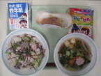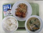 3/23 わかめごはん とりのからあげ パリパリチーズサラダ お祝いすまし汁 抹茶タピオカゼリー |