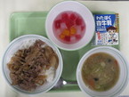 3/19 牛丼 根菜のみそ汁 フルーツポンチ