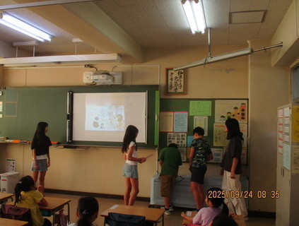 6年生は、タブレットを活用して絵本のページをスクリーンに映し出しながら、分かりやすく伝わるように工夫して読み聞かせをしました。1年生は、スクリーンに映し出された絵とお兄さん・お姉さんの声にじっと耳を傾け、物語の世界を楽しんでいました。
