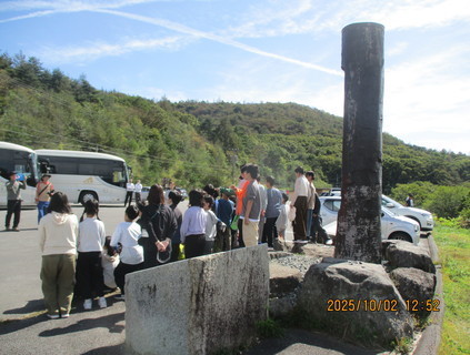 獅子岩の絶景を満喫!(第2日③ 輝石探し) 2025年10月2日 その後、獅子岩へ移動し、昼食のお弁当をいただきました。 大自然の中で食べるお弁当は格別で、元気をチャージした子どもたちは、輝石拾いをしたり、獅子岩に登って景色を眺めたりして楽しみました。この後、子どもたちは、美しの森へと向かい、ハイキングを行います。豊かな自然の中で、さらに新しい発見を重ねていきます!