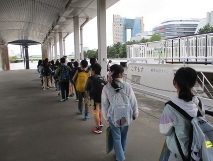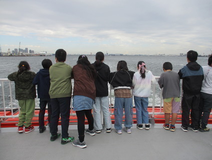 まず、東京港社会科見学船に乗り、有明客船ターミナル周辺の様子を見学しました。船の上からは港の広がりや、コンテナふ頭、クレーンの動きが一望でき、子どもたちは興味深そうに見入っていました。港で働く人々の工夫や役割を学び、社会科で学んだ内容を実際の風景と重ね合わせながら理解を深めることができました。