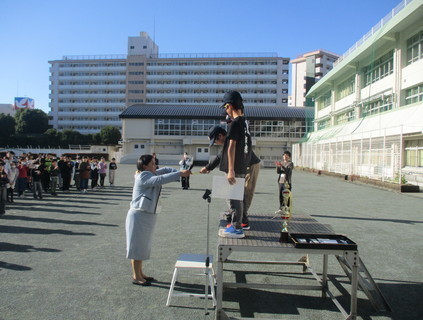 代表児童が賞状とトロフィーを受け取る姿に、全校児童から温かい拍手が送られました。