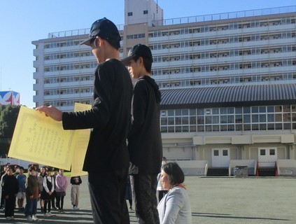 全校朝会(表彰 あいさつ運動 各クラスの目標発表)