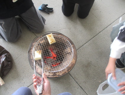 今回は七輪でおもちを焼きました。炭火の上で少しずつふくらむ様子を見守りながら、火加減の難しさや、昔の人々がどのように調理をしていたのかを実感することができました。便利な電気やガスがある今のくらしと比べながら、道具の工夫や生活の変化について考える貴重な学びとなりました。