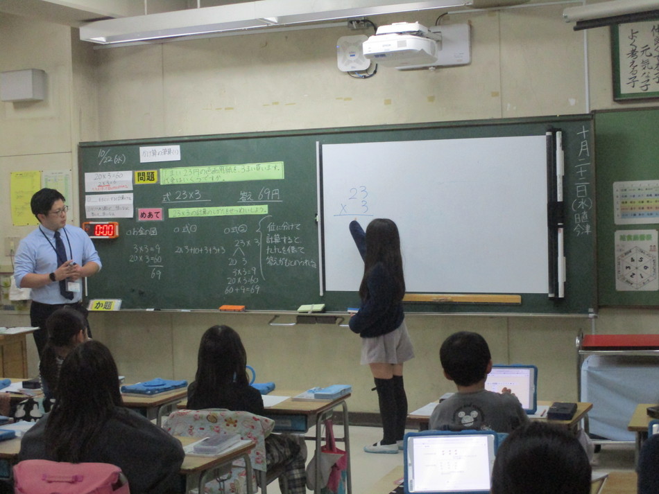 10月22日(水)、3年生が算数科「かけ算の筆算(1)」の学習で、校内研究授業を行いました。