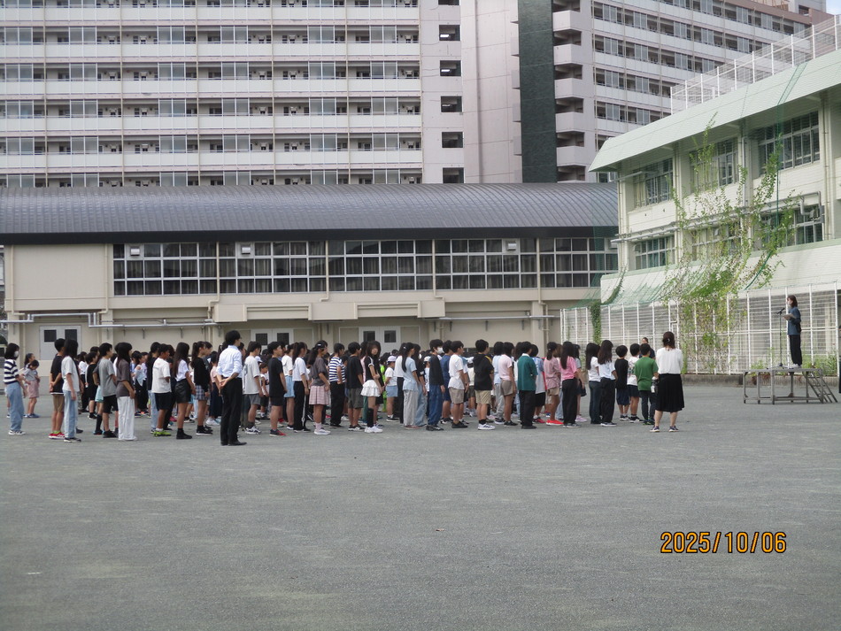 その月の初めの月曜朝会は校庭での全校朝会です。