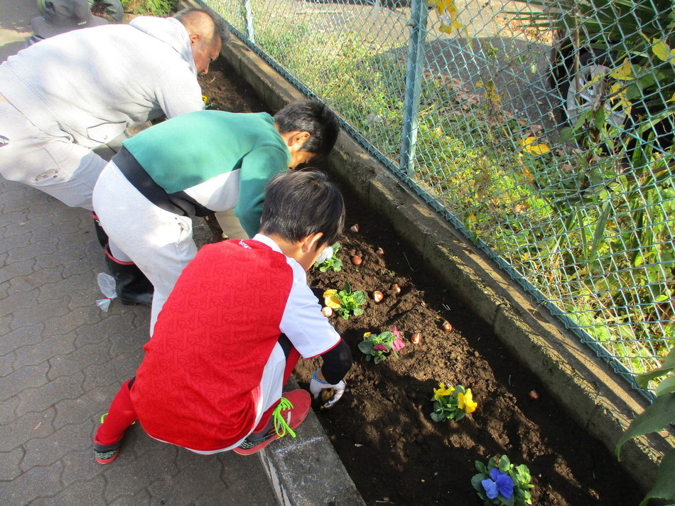 〈本校 南門からの通路脇花壇とジンダイアケボノのまわりにて〉