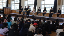 今日ホールで修了式をしました。各クラスの代表が修了証を受け取り、児童代表の言葉を1年生2名が務めました。続いて転退職の先生方の離任式も行われました。