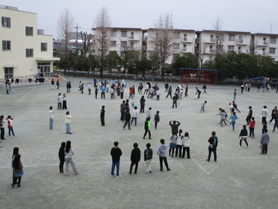 クラブ活動前の給食時間の終わりごろ、校庭に人かげが…。