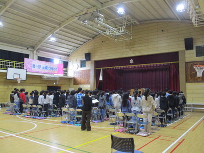 外国語の授業の一環として、台湾からの留学生(法政大学)を招いて、体育館でお話を聞きました。