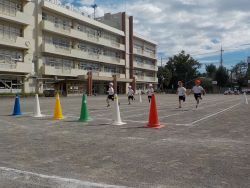 並んだあとはいよいよ走ります。走るときに気をつけたいのは、ゴールする前で走りをゆるめないことです。そのために、ゴールの先にコーンを置いてコーンをタッチするまで全力で走ります。