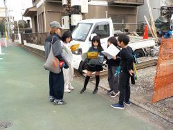 子どもたちは「ここは道も細いし人通りも少ないので犯罪が起きやすいかも」「この道はガードレールがないから車に気をつけない」「この公園は木に囲まれて外から見えにくい」「子どもの家マークがあるから、危ない時には駆け込めるかも」等、気づいたことをメモしたり、タブレットで写真を撮ったりしました。