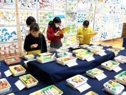 「6年生の作品がリアルに体験している感があってすごい!」「この絵、空の色がすごくきれいです。松の木の様子も鉄棒側から見たまんまです。」「3年生の危険な山に登っているたいへんさが伝わってくる。」「5年生のワイヤーで作ってあるイチゴのかき氷 表現力がすごい。」「1年生のお弁当は、どれもおいしそうでみんな食べたくなります。」等々。