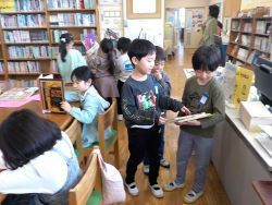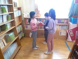 今、図書室は冬休みの特別貸し出し中です。1年生は3冊まで借りることができます。ふだんよりたくさん借りることができるので、みんな借りる本を夢中になって探します。友だちはどんな本を選んだのかも気になる様子です。また、「この本おもしろいよ」と他の子に勧める子もいます。ほとんどの子は3冊選ぶことができました。