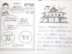 献立は「パエリア風ピラフ」「フライドチキン」「クリスマスカラーサラダ」「星空スープ☆☆☆」と、わくわくするメニューです。さらに、飲み物はリザーブで「ぶどうジュース」か「コーヒー牛乳」の好きな方を選べます。