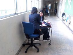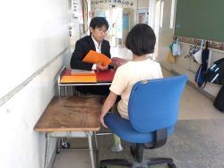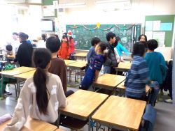 終業式後は、学級で特別活動でお楽しみ会をしたり担任の先生から「通知表」を受け取ったりします。教室でお楽しみ会の準備をしている間、廊下で子どもたち一人一人に先生が2学期がんばったことを「通知表」を見せながら説明して渡しました。