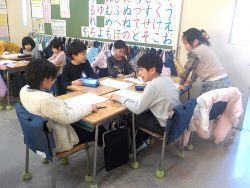 みんなと一緒にどんなことを知らせたいのかを相談して文章や絵に表していました。