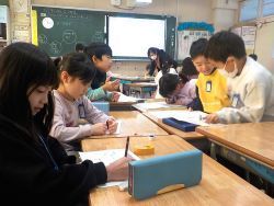 今日は学校の中を紹介するのに、グループになって誰がどこを紹介するのかを決めて、紹介のための文と絵をかきました。