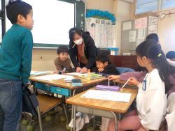 「私は教室を紹介します。読み書きや計算の勉強をするところだと知らせたいです。」「ぼくは校庭を紹介します。たくさん遊んで、友だちがたくさんできることを知らせたいからです。」と、紹介するための文を書いてグループの中で発表していました。