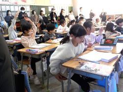 2年生のクラスでは、国語で「ようすをあらわす言葉」の学習をしていました。詳しく説明するためにどんな言葉を使ったらいいかを考えます。教室の後ろには保護者の方が大勢観ています。2年生は後ろの保護者が気になりながらも、しっかり授業に集中していました。保護者の方は1年間の成長を感じているようでした。
