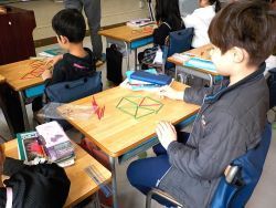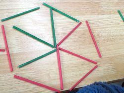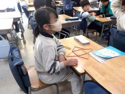 次に、子どもたちがいろんな形を作り始めました。8本使ってヨット、中には数え棒12本を使って正六角形の中に正三角形を6つを作る子も出てきました。