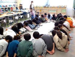 「ハンカチ落とし」をしているクラスでは、進行役の指示の通りみんな頭を下げて見ない様にしています。