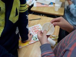 紙コップと糸で糸電話、輪ゴムと紙コップで車を作ろうとしている子もいました。