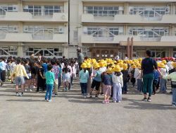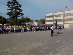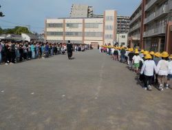 今日の朝は1年生と2年生以上の子どもたちとの顔合わせの「対面式」です。校庭に2年生以上の人たちが並んでいるところに1年生が入場してきました。2年生以上の人たちは大きな拍手で迎えます。1年生はうれしそうです。1年生が全員並んだところでお互いに「よろしくお願いします」と元気よくあいさつをしました。その後、1年生も朝会の場所に整列して全校朝会がはじまりました。校長先生のお話です。『今日はあいさつの話をします。あいさつは人の心と心をつなぐ大切な言葉です。どんなあいさつがあるでしよう。おはようございます や ありがとうございます などがあります。では、どんなあいさつをすればいいでしようか。「あ」は相手を見てです。「い」はいつもてす。「さ」は相手よりも先にします。「つ」は伝わるように言いましよう。これからみんなで気持ちのよいあいさつをしていきましょう』。校長先生のお話を1年生もしっかり聞くことができました。気持ちよいあいさつを通して、笑顔あふれる学校にしていきたいと思います。