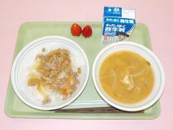 1年生は4月13日(月)から給食がはじまりました。今日は給食の2日目です。昨日一度給食を準備したり食べたりしたので、今日はだいぶスムーズに給食を食べることができました。まずは配膳の準備です。全員手を洗って自分の席にきちんと座ります。給食当番の人は給食当番用の帽子、マスク、白衣を着て配膳の準備をします。待っている人は静かに上手に待っています。全員の配膳が終わりました。いよいよ「いただきます」です。今日のメニューは「豚丼」「具だくさんみそ汁」「いちご」「牛乳」です。「みんなおいしそう」「わたしはごはんが大好き」「イチゴが楽しみ」など、いろんな声が聞こえてきます。1年生のみなさん、給食は栄養たっぷりで毎日どんなメニューなのか楽しみですよ。たくさん食べて元気に過ごしてください。